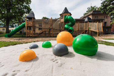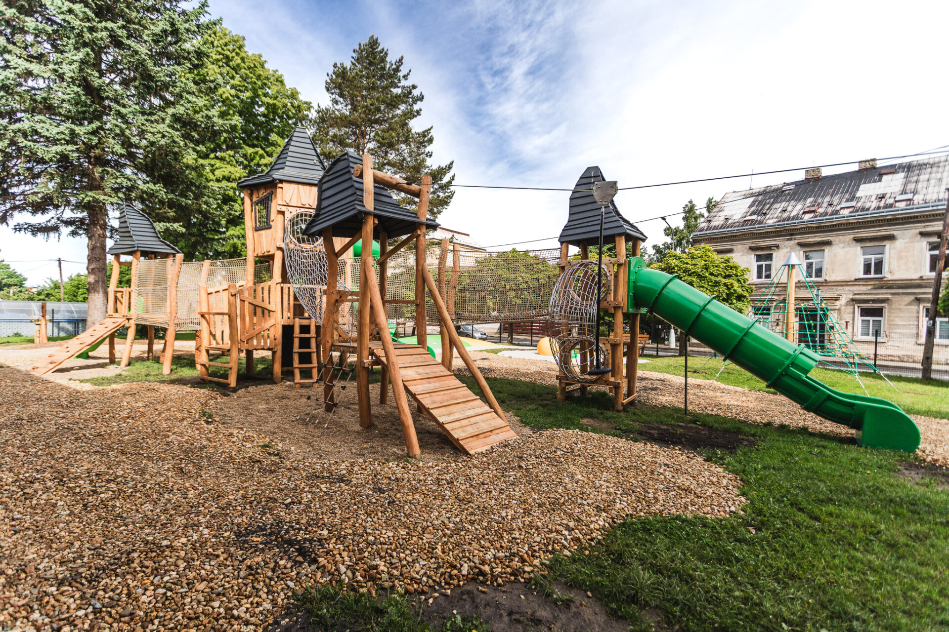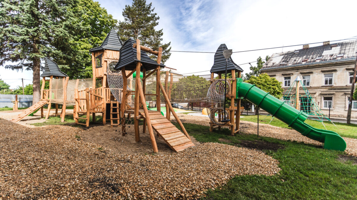 Dominantou celého prostoru je rozsáhlá sestava s tobogány, inspirovaná naším řešením z Vratislavic. „Věděli jsme, že hřiště má být jedinečné a s prvky, které může zákazník objednat pouze u nás,“ popsala Nikola Josifová zadání, které už od října 2024 formovalo podobu hřiště.
