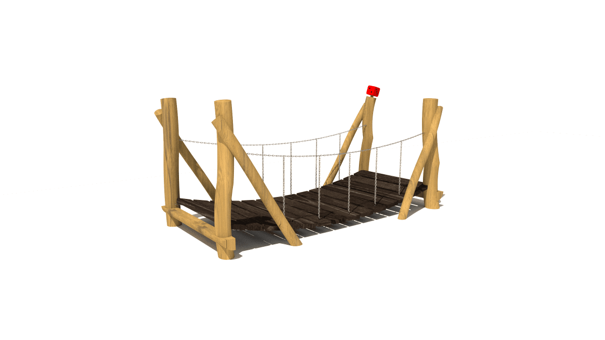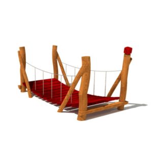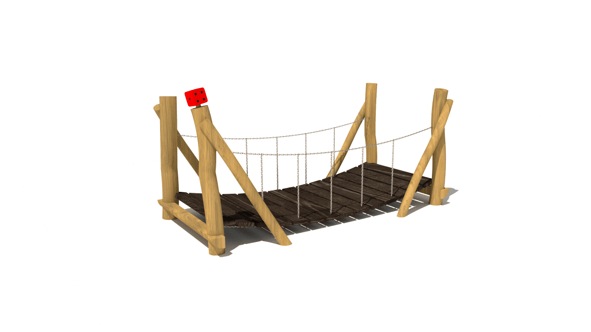 Lamelový zavěšený mostek z latí, vyrobený z akátového a dubového dřeva.