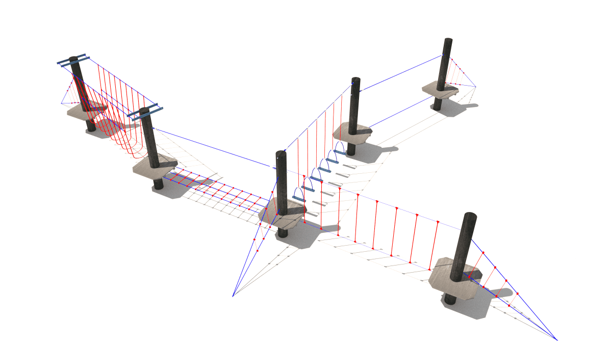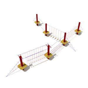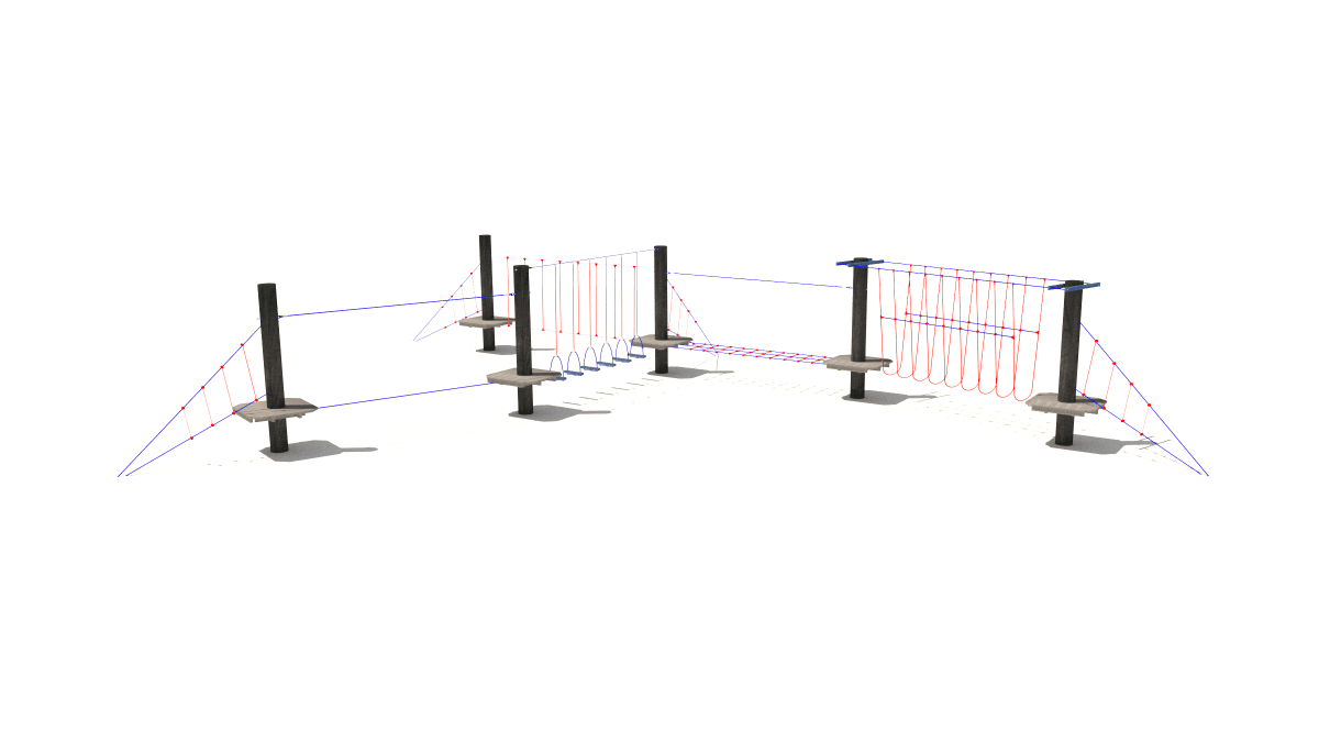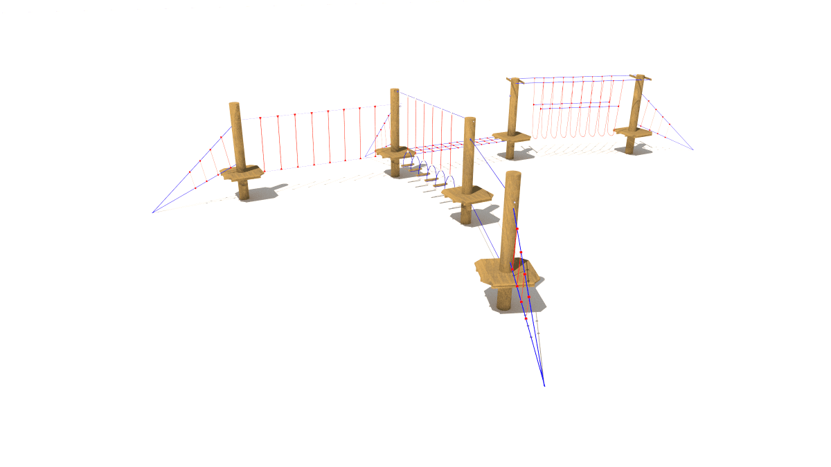 Dětská lanová sestava s balančními prvky, vyrobená z akátového a dubového dřeva.