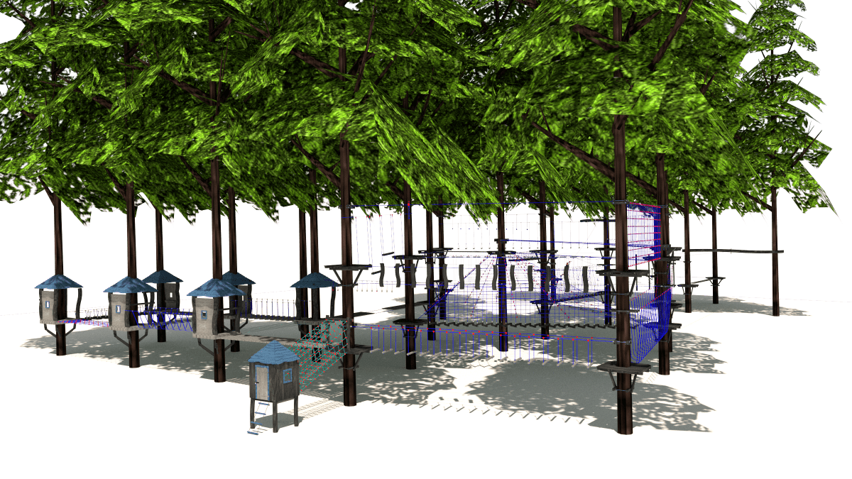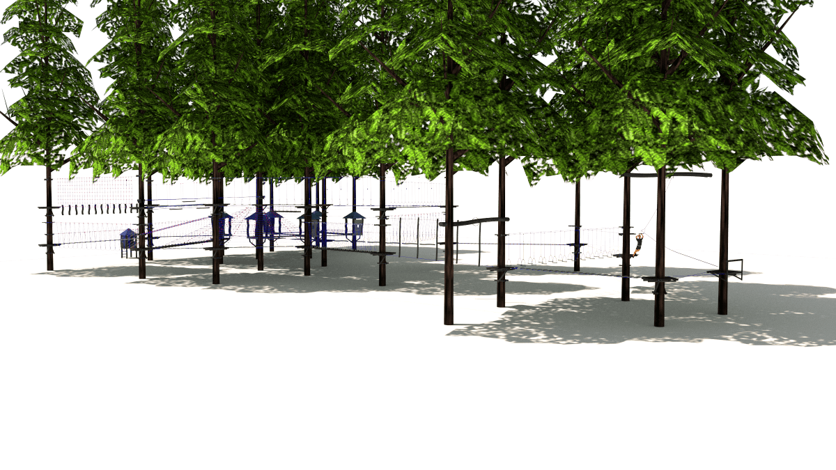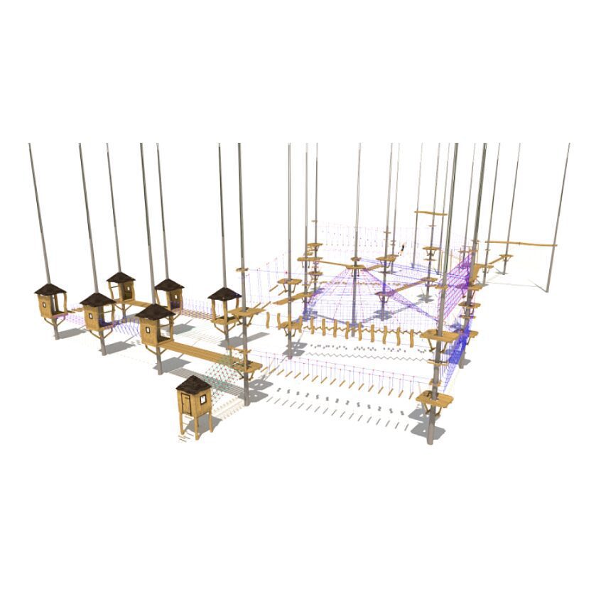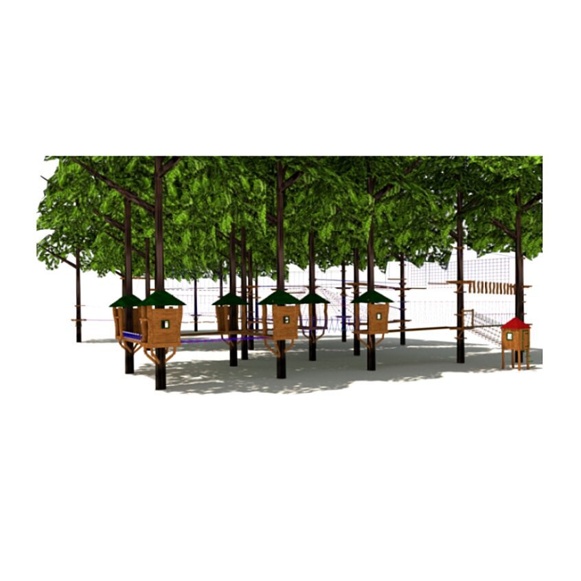 Dětská lanová stezka mezi stromy s balančními prvky, vyrobená z akátového a dubového dřeva.