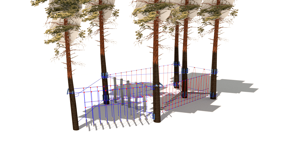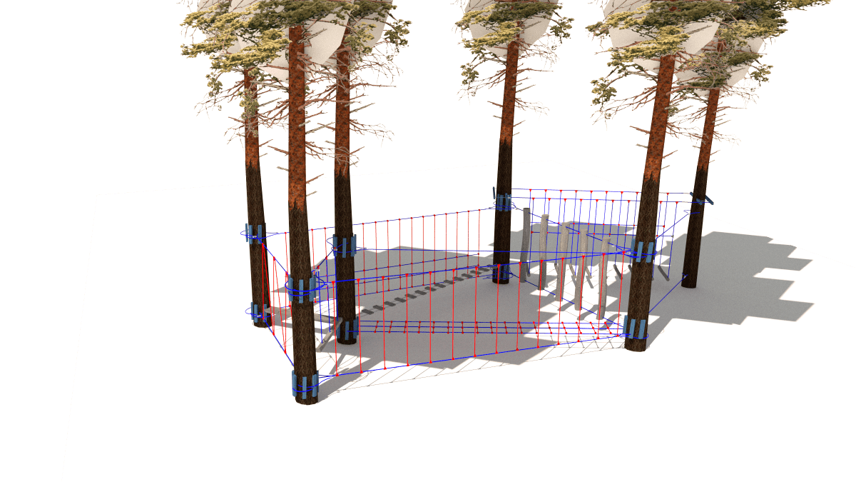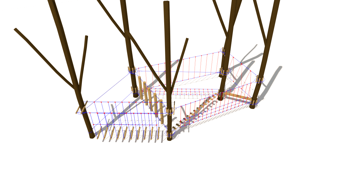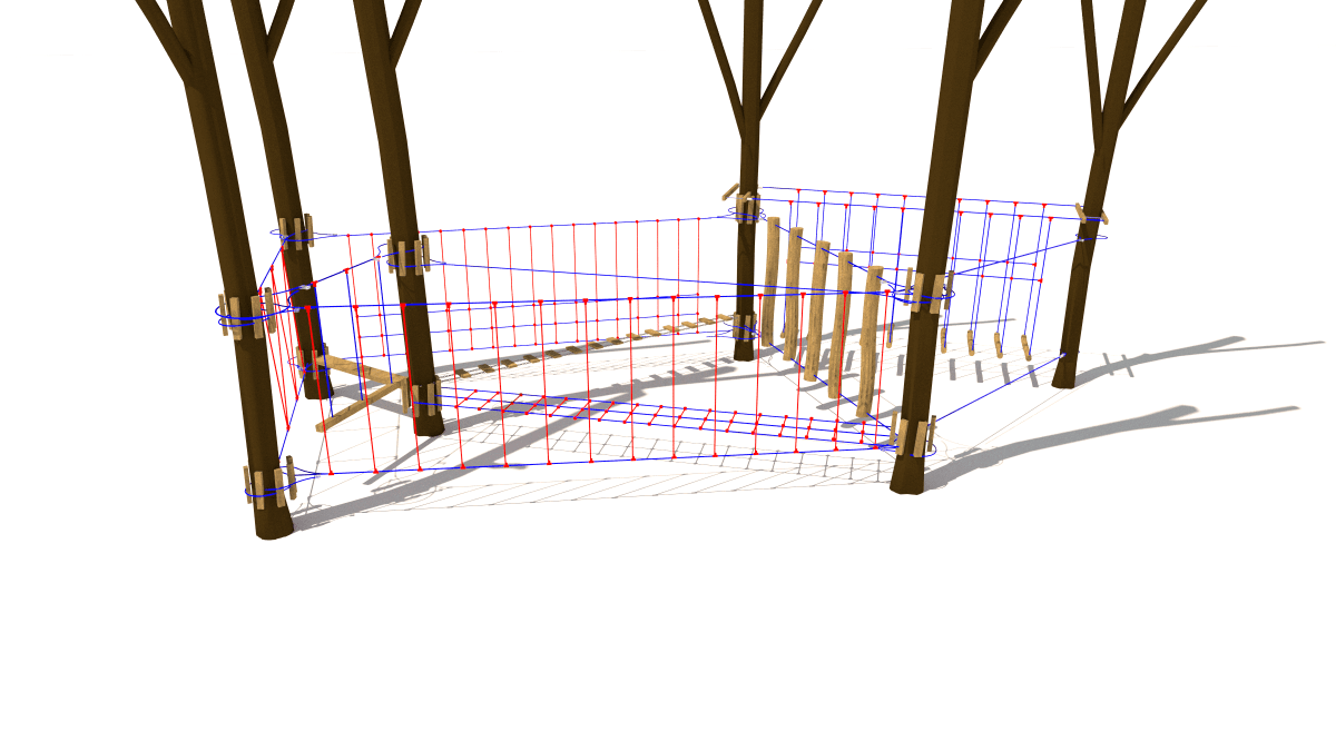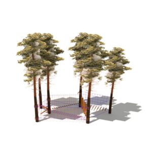 Dětská lanová stezka mezi stromy s balančními prvky, vyrobená z akátového a dubového dřeva.