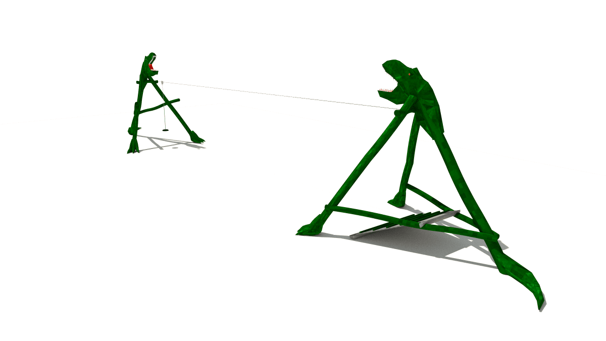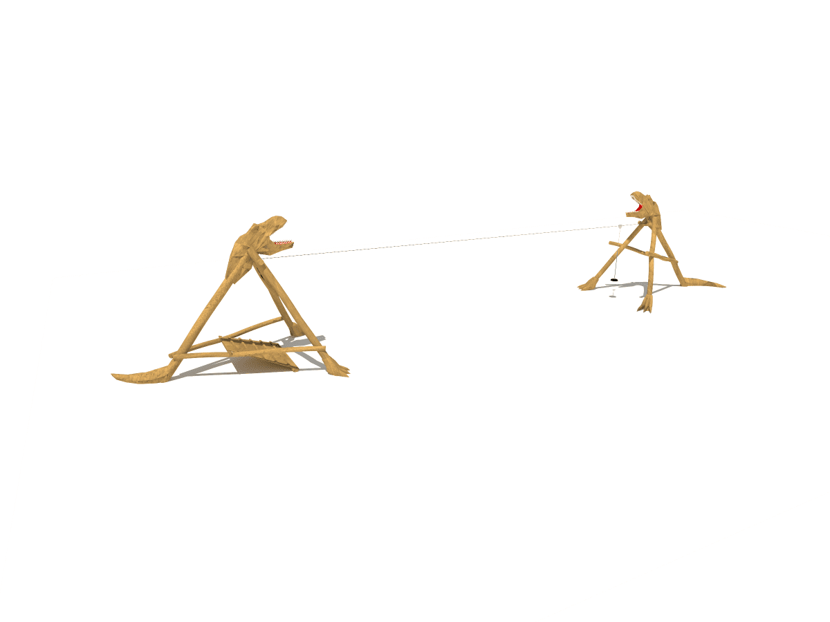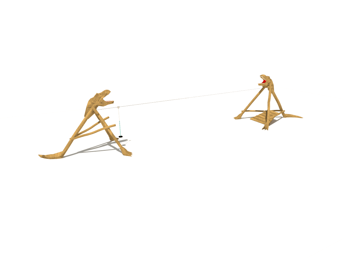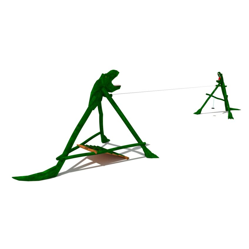 Dřevěná dětská lanovka ve tvaru dinosaura, vyrobená z akátu a dubu.