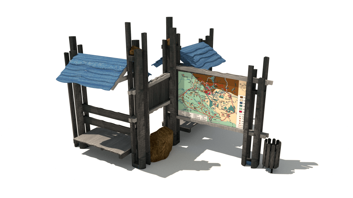 Dřevěné odpočívadlo s mapou a košem vyrobené z akátového a dubového dřeva.