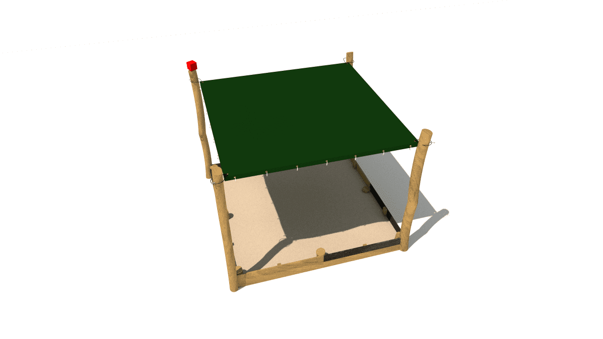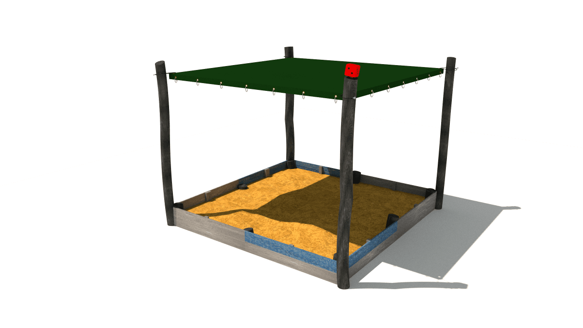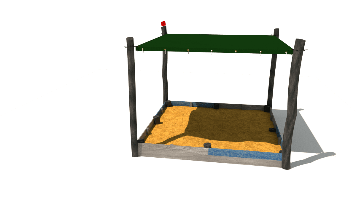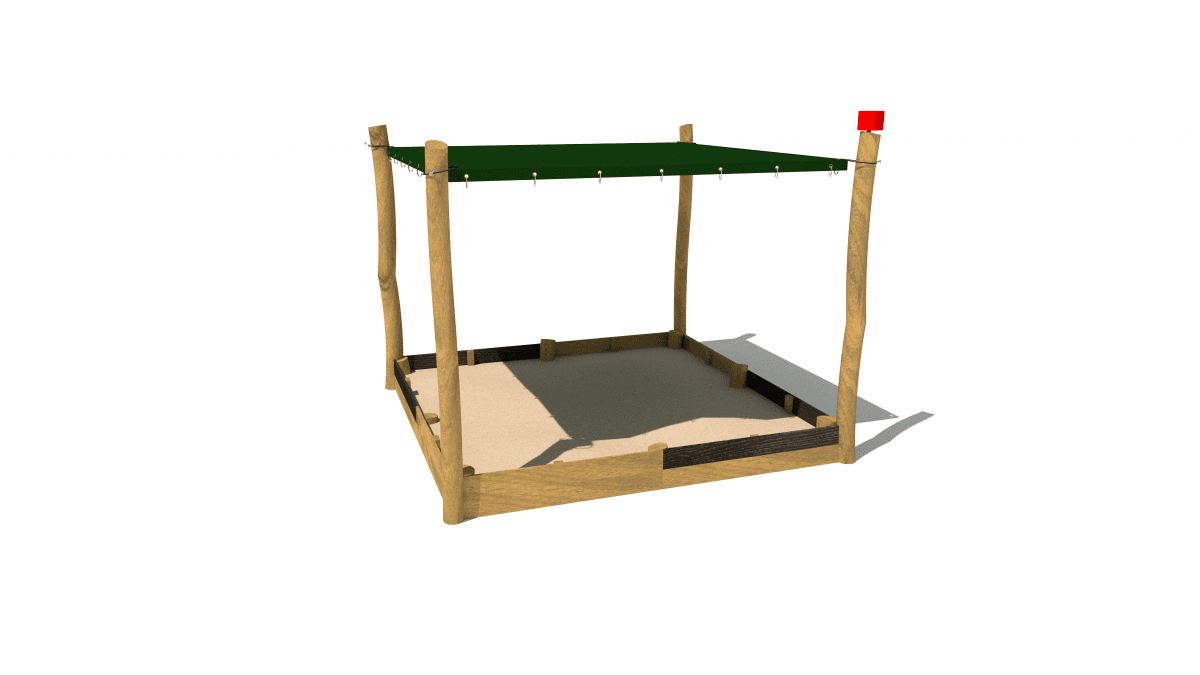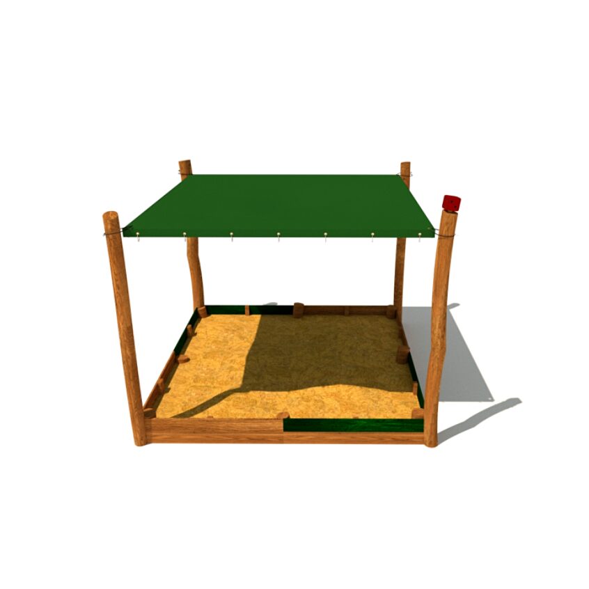 Dřevěné dětské čtvercové pískoviště s plachtou na kůlech, vyrobené z akátu a dubu.