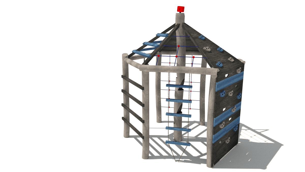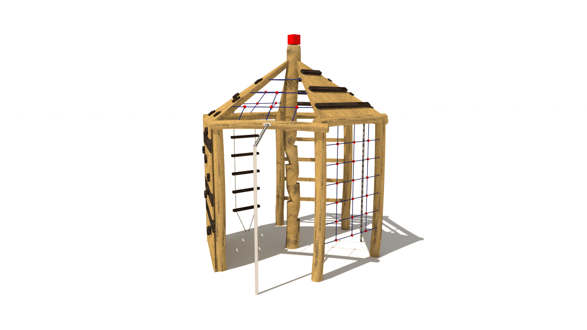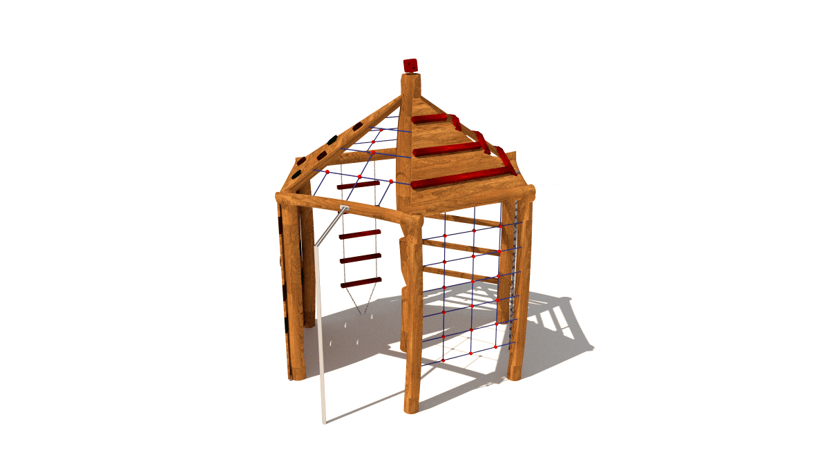 Dřevěná dětská prolézačka s lezecími komponenty, vyrobená z akátového a dubového dřeva