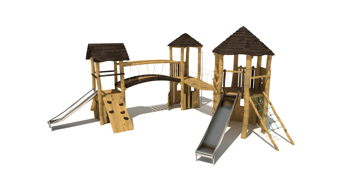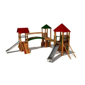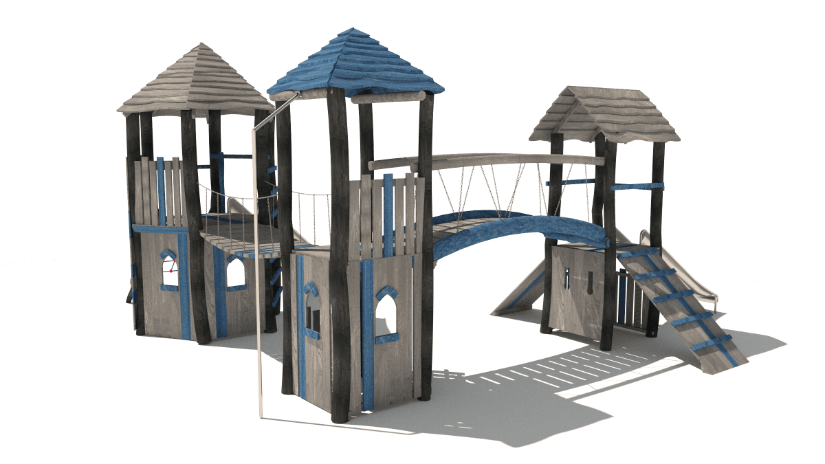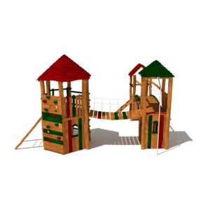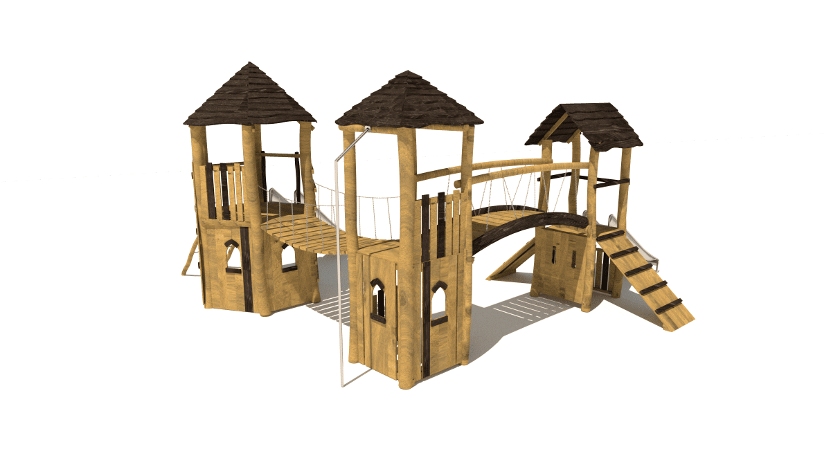Dřevěná dětská sestava hrad s věžemi, skluzavkami a mostky, vyrobená z akátového a dubového dřeva