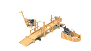 Dřevěná dětská sestava letadlo pro handicapované s pískovištěm a houpací plošinou, vyrobená z akátového a dubového dřeva