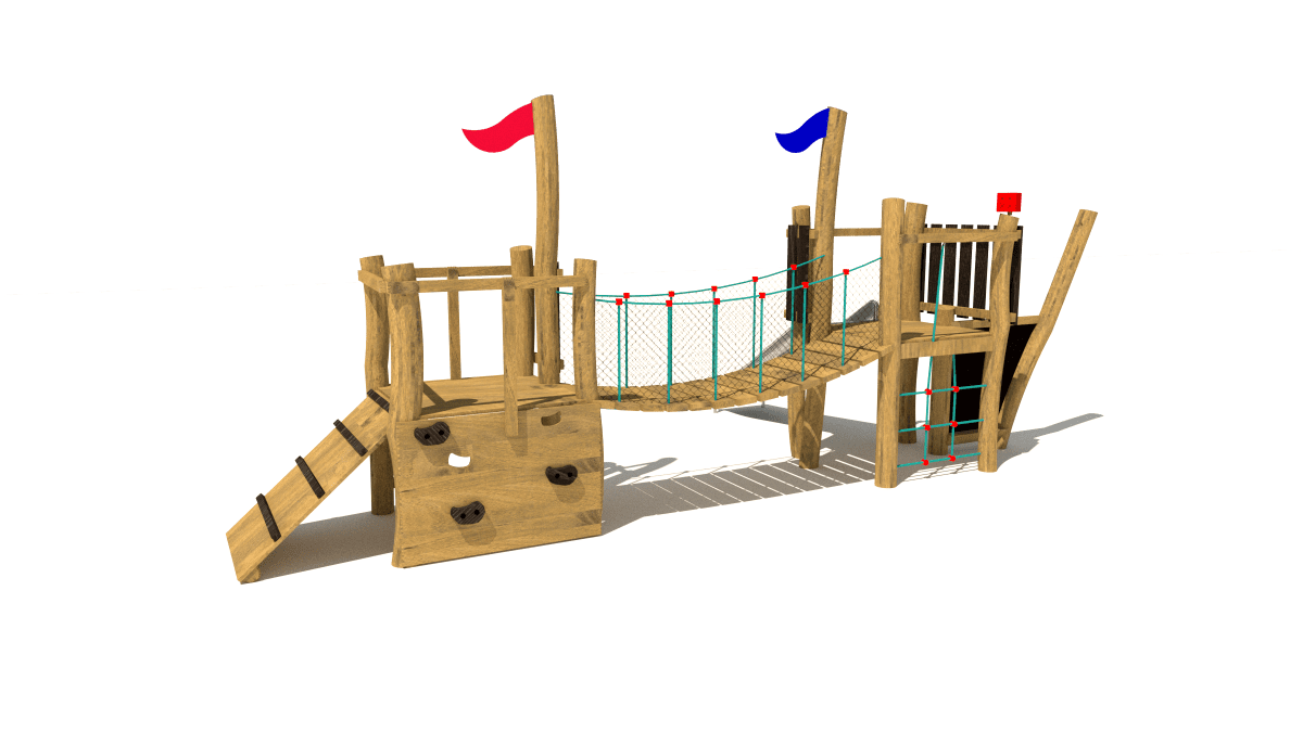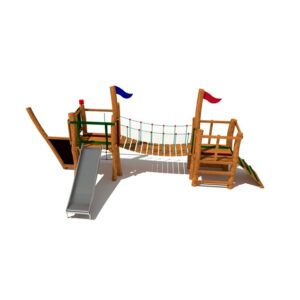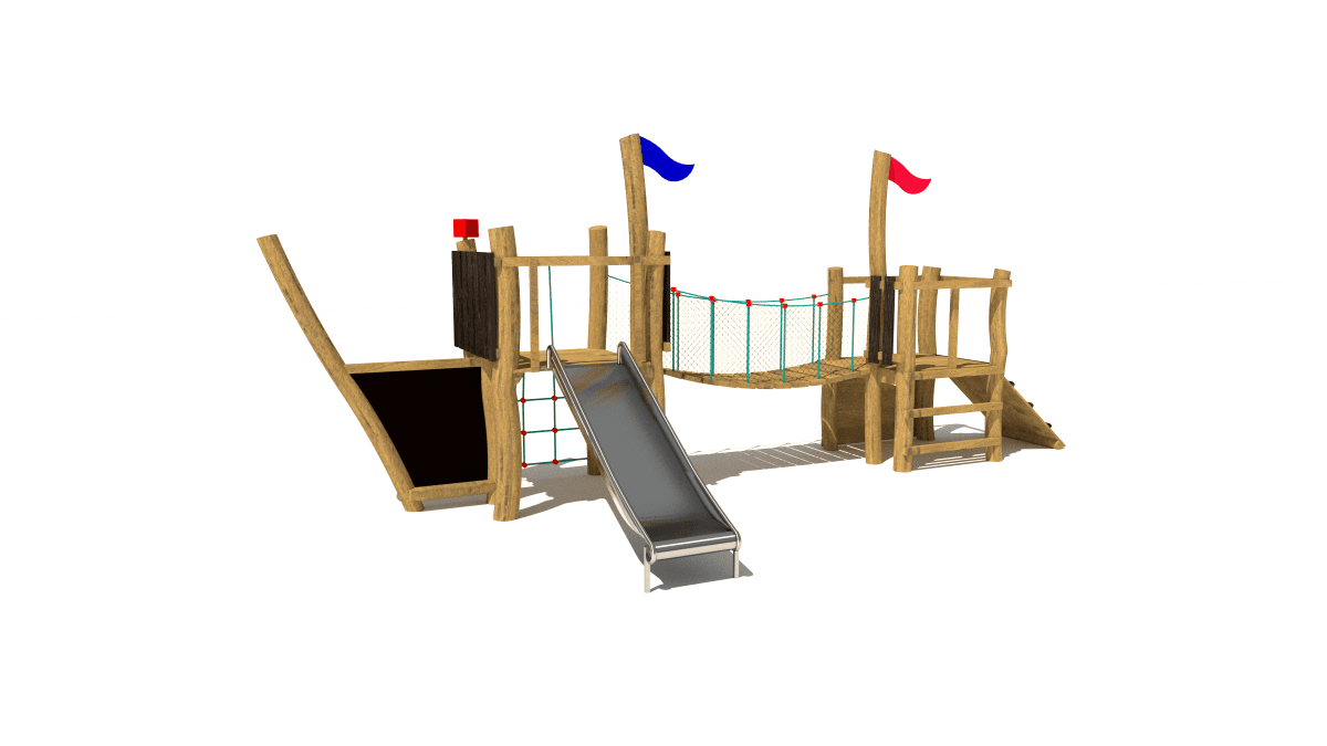 Dřevěná dětská sestava s věžemi a skluzavkou, vyrobená z akátového a dubového dřeva