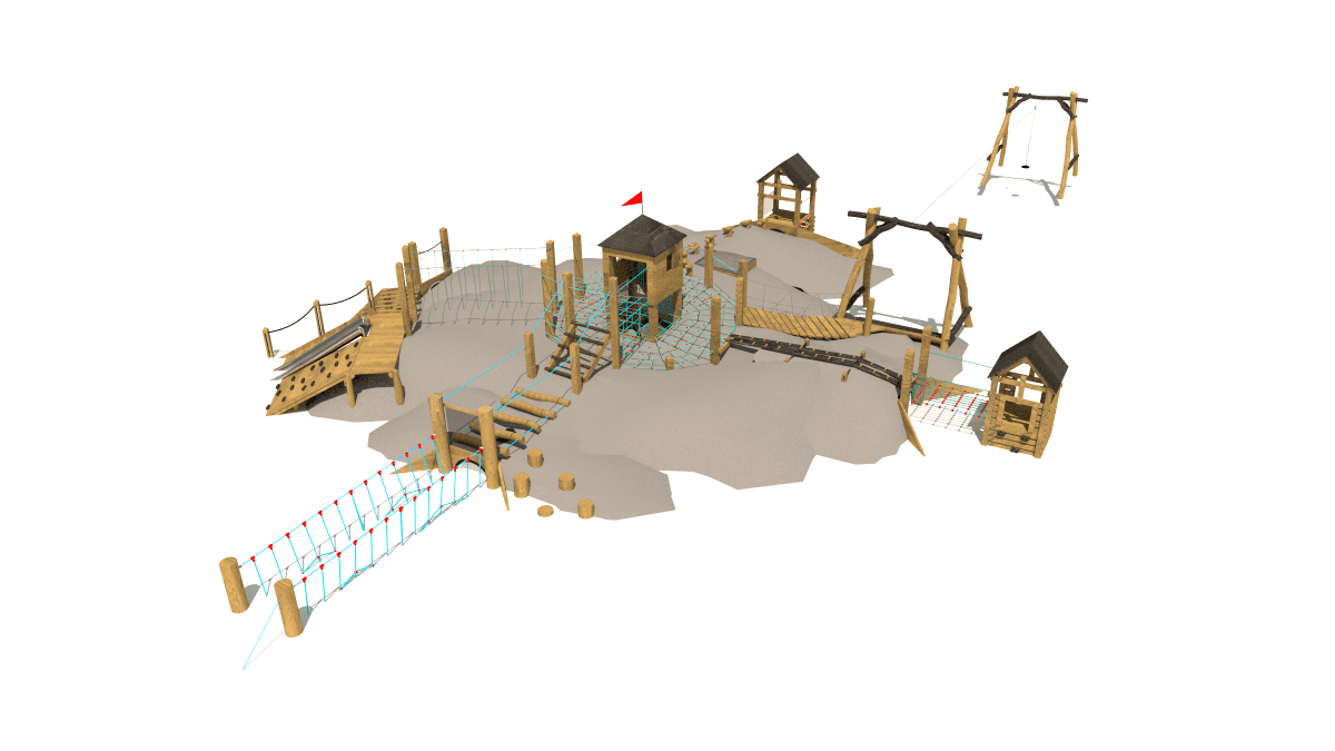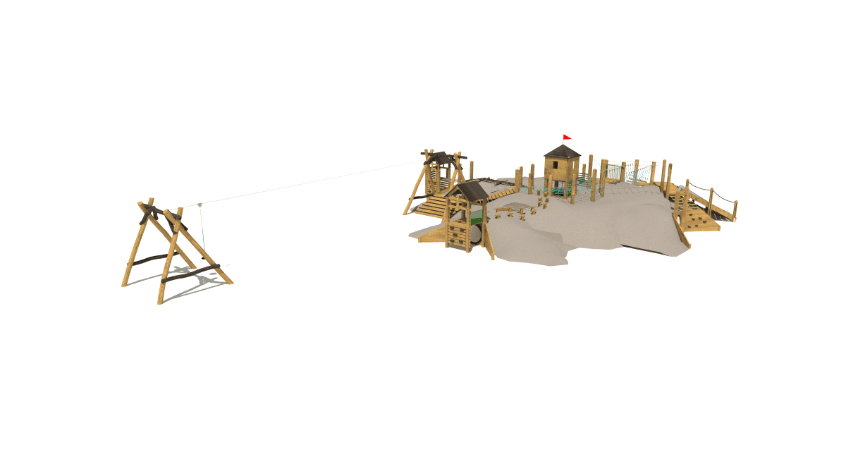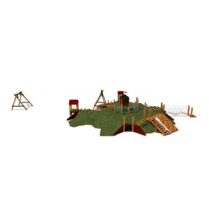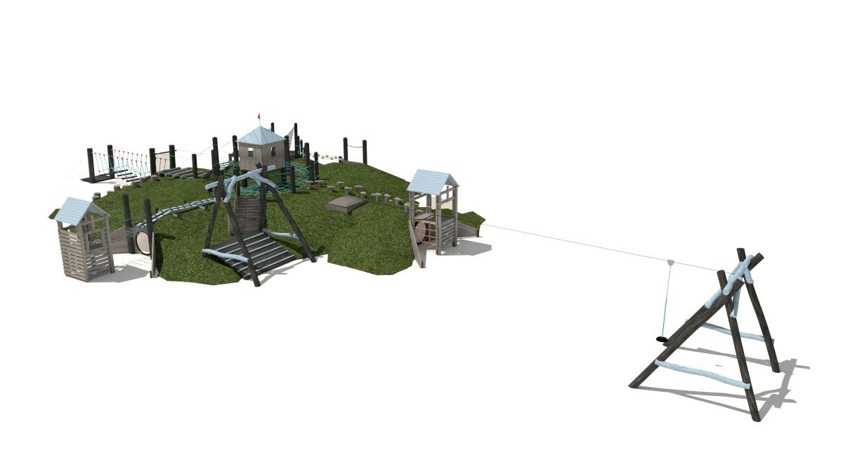 Dětská sestava s tunely na prolézání, věžičkami a lanovkou, vyrobený z akátového a dubového dřeva.