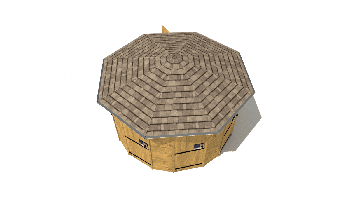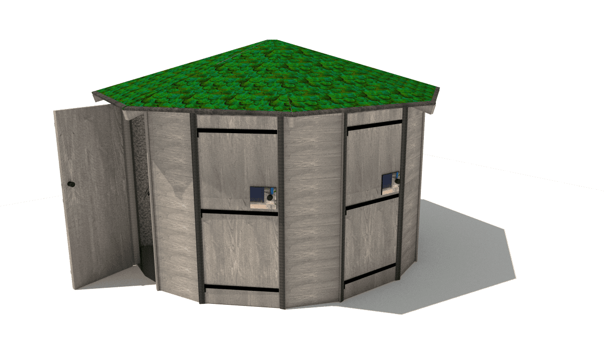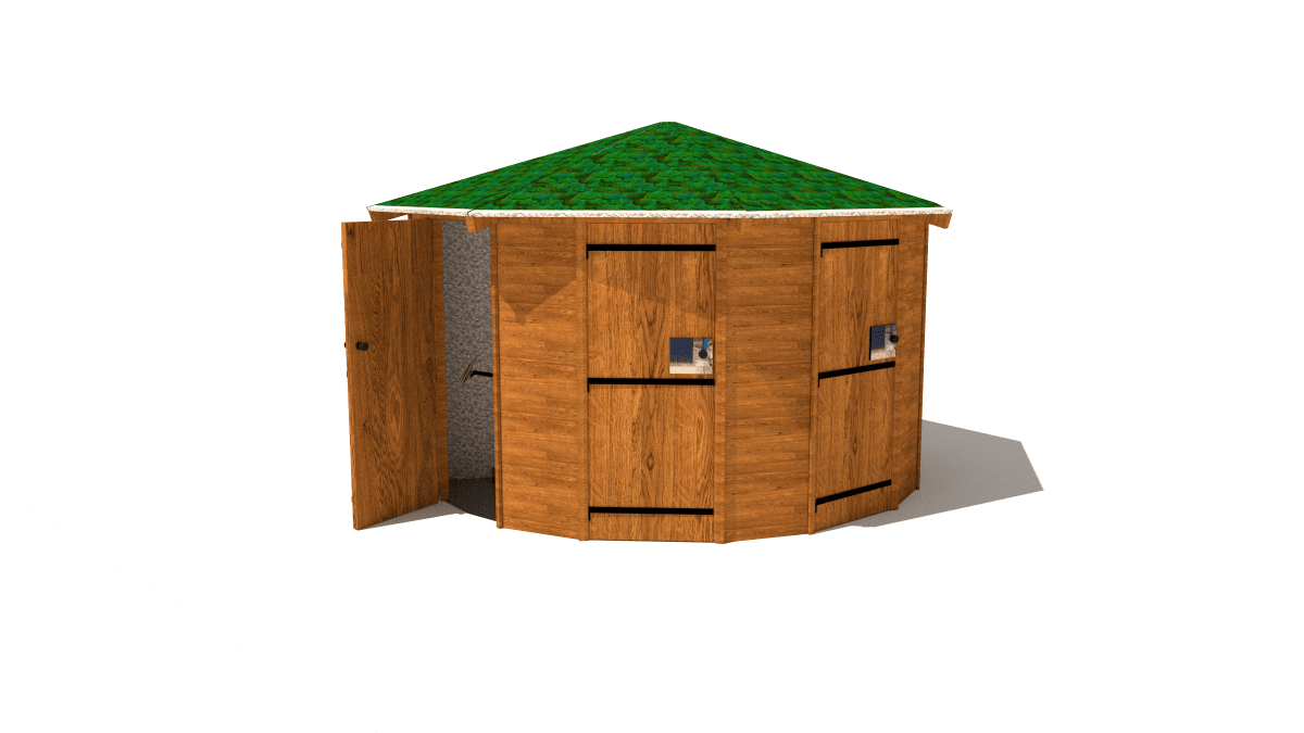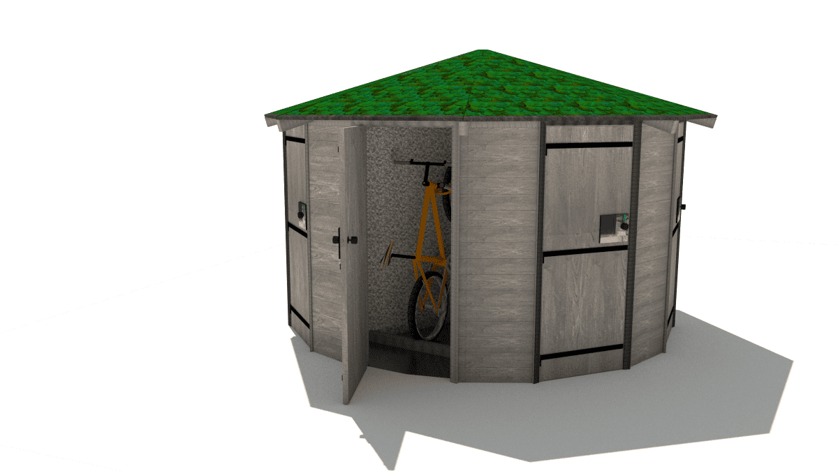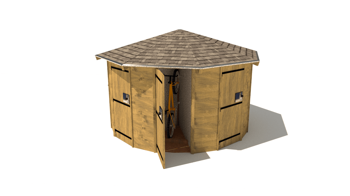 Dřevěný uzamykatelný domeček na úschovu kol, vyrobený z akátového a dubového dřeva.