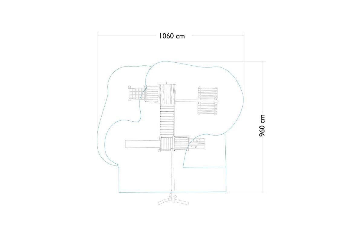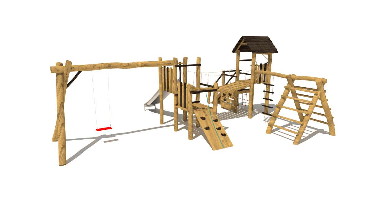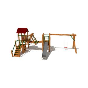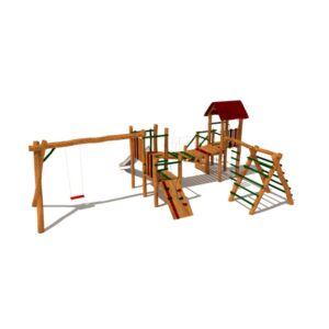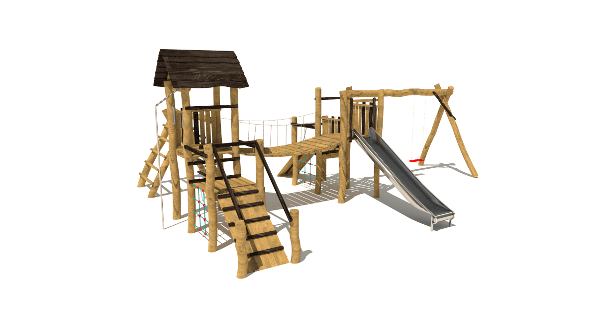 Dřevěná dětská sestava s věžemi, skluzavku, a dalšími lezecími prvky, vyrobená z akátového a dubového dřeva